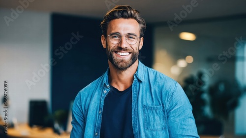man, portrait, smiling, happy, businessman, photogenic, goggles, beard, office, success, confident, professional, cheerful, adult, male, young, business, indoor, studio, work, positive, person, face, modern, style, attractive, happiness, expression, caucasian, looking, casual attire, well-dressed, career, employment, stylish, smart, executive, company, employee, closeup, head shot, upbeat, people, bearded, interior, light