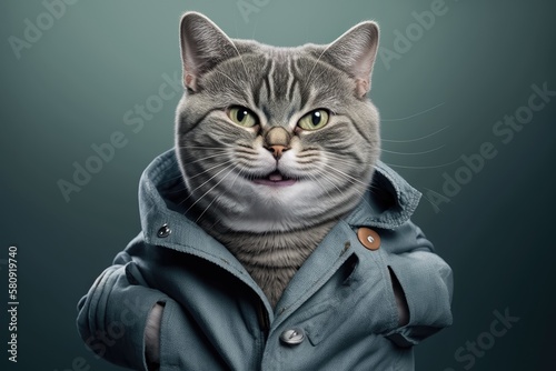 portrait, cat, smiling, stylish, generative, ai, outfit, animal, kitten, pet, cute, felino, domestic, fur, pet, cat, mammal, tabby, adorable, grey, yellow eyes, paw, whisker, soft, fluffy, striped, sleek, mischievous, jacket, dark background, fashion, trend, contemporary, digital artwork, trendy, fun, photo, illustration, nobody