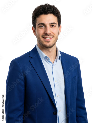 Portrait of a smiling young businessman in a blue suit and light blue shirt, isolated on white background.