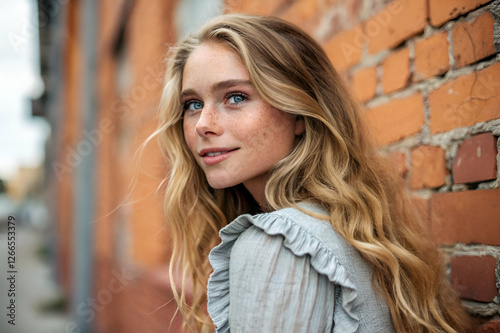 portrait, young, woman, freckle, red, brick, wall, natural, light, wavy, hair, caucasian, blue, eye, shoulder, length, casual attire, wear, pretty, smiling, looking, camera, female, person, 1, youth, face, beauty, model, attractive, lifestyle, daylight, brick, posing, close, girl, spring, dreamy, romantic, soft, warm, texture, background, city, youthful, head shot