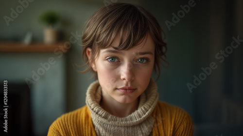 hoyden, looking, young, girl, short, brown, hair, teenage, wearing, yellow, sweater, turtleneck, children, face, children, expression, youth, childhood, serious, living room, fireplace, background
