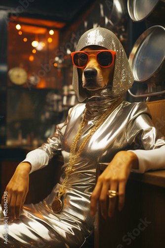 Portrait of a woman in a shiny dress and sunglasses with a dog's head at a disco party