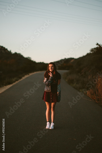 Portrait of a woman smiling in road wearing a short skirt with lines overhead