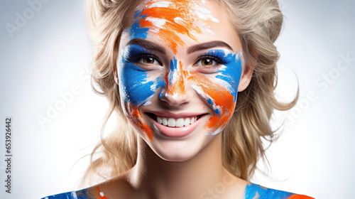 Portrait of a woman with abstract painted face in blue and orange colors.