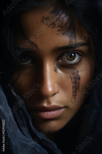 Portrait of a Woman with Tribal Face Paint and Intense Eyes