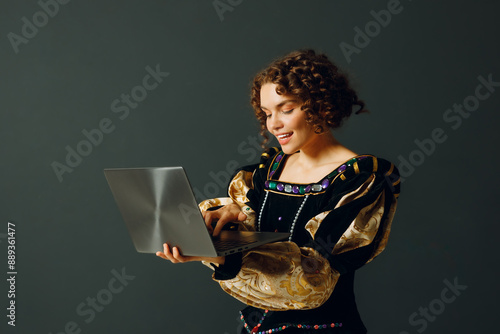 mediaeval, dress, woman, laptop, working, technology, portrait, vintage, aristocratic, dark, young, background, isolated, girl, renaissance, history, retro, style, queen, princess, antique, person, lady, historical, historic, duchess, costume, female, countess, dressed, noble, baroque, ancient, aristocrat, traditional, remake, clothing, gothic, social, media, future, tech, advertisement, old, fashioned, computer