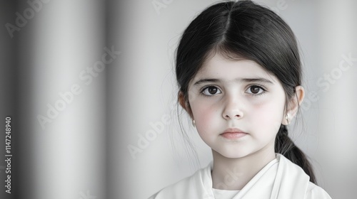 girl, children, portrait, young, children, face, eye, hair, dark, brown, expression, serious, innocent, cute, beautiful, pretty, small, little, female, person, human, model, fashion, style, beauty, childhood, innocence, youth, sweet, adorable, tender, delicate, calm, peaceful, quiet, pensive, thoughtful, gaze, look, stare, head, shoulder, closeup, studio, background, white, simple, elegant