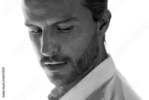 fine, art, moody, creative, artistic, shadow, fashion, style, glamour, elegant, sensual, depression, black, monochrome, dramatic, mysterious, studio, health, mental, stress, depressed, sad, anxiety, model, man, male, face, people, portrait, person, 1, caucasian, isolated, white, background, young, attractive, adult, business, corporate, businessman, professional, occupation, executive, successful, ceo, entrepreneur, thinking, brainstorm