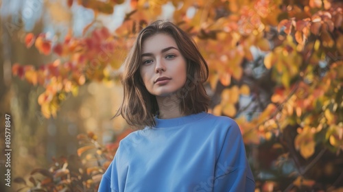 portrait, young, woman, blue, sweatshirt, autumn color, fall season, autumn, female, fashion, background, leaf, tree, beauty, style, casual attire, comfortable, clothing, apparel, model, attractive, trendy, stylish, cosy, warm, mock-up, outfit, seasonal, autumn, lady, fashionable, fashion model, garment