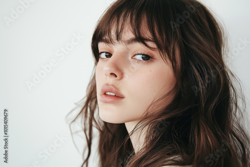 portrait of a young woman with brown eyes and layered hair with side bangs looking directly at the camera