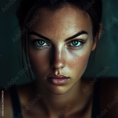 portrait, missy, green eye, beauty, closeup, face, natural light, expression, female, emotion, model, photo, head shot, realistic, dark background, fashion, artistic, captivating