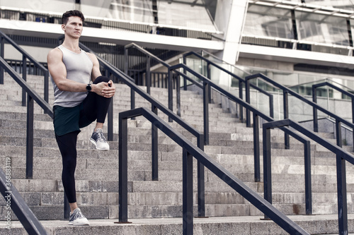 Portrait of an athletic sportsman in jogging sportswear. young fitness man runner stretching legs before jogging. Warm up firstly. healthy life and self-control concept. Man stretchin