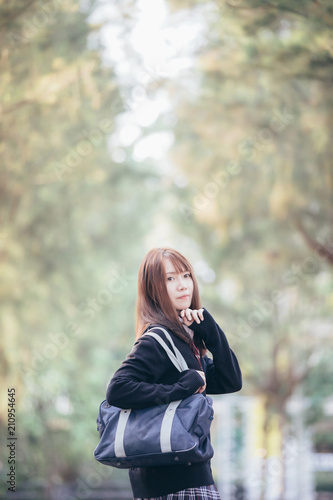 Portrait of asian japanese school girl costume looking at park outdoor film vintage style