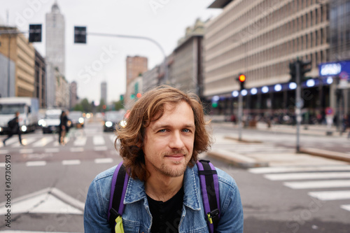 Portrait of attractive young long hair casual wear tourist man with black t-shirt and jeans jacket smiling and looking straight to camera with big city background. Travel and lifestyle concept