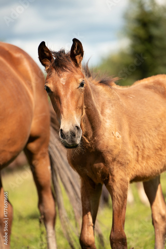 portrait of bay sportive foal grazing at pasture with mom. sunny summer day.