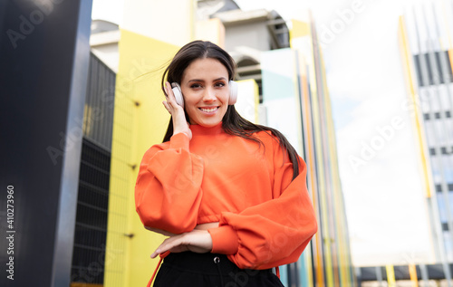Portrait of beautiful brunette standing outdoors and smiling while listening to music on headphones