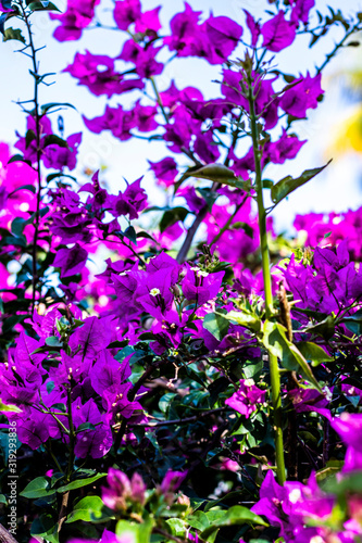 Portrait of beautiful purple bougainvillea flowers with green leaf and blue sky in background with sunlight, front focus and blurred background, vertical image