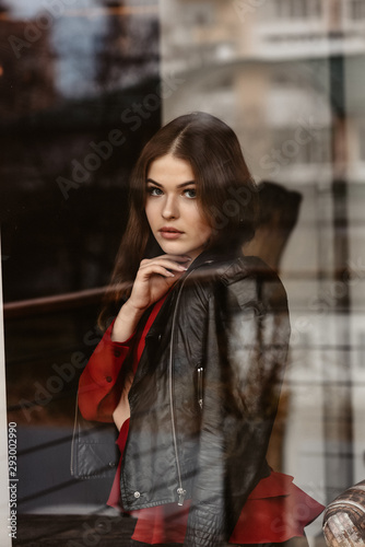 Portrait of beautiful woman, captured through the window glass