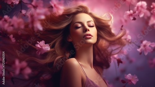 Portrait of beautiful woman with hair flying in the air in serene spring mood with flowers and blossom in background.