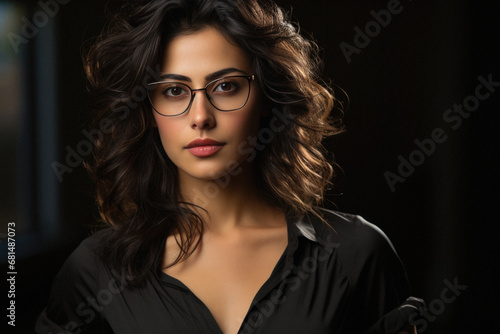 Portrait of beautiful young woman in eyeglasses on dark background.
