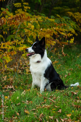 Portrait of beauty border collie. Young dog in the park, playing dog on the grass in the autumn, beautiful nature colors
