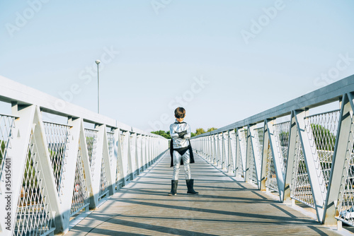 Portrait of boy disguised as superhero standing on a footbridge
