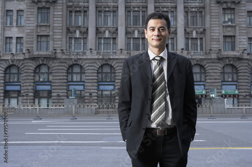 businessman, chinese, one person, adult, people, male, man, well-dressed, suit, full suit, attaching, adults only, asian ethnicity, businessperson, business, confidence, success, occupation, professional occupation, expertise, shanghai, china, east asia, asia, street, city life, urban scene, building, sidewalk, outdoors, city, smiling, cheerful, happiness, joy, enjoyment, standing, modern, photo, horizontal, copy space, building exterior, color image, day, facades, stone, rock, front view, portrait