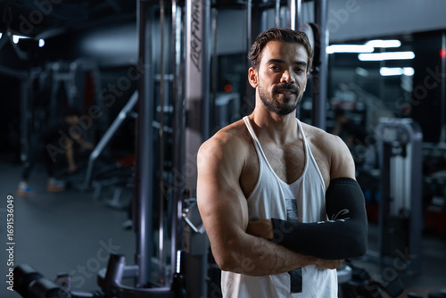 Portrait of caucasian muscular sport man with perfect abs and bicep muscle inside gym with dark background for exercise and workout in high contrast low key lighting studio