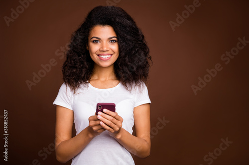 Portrait of charming positive afro american girl use cell phone enjoy blogging social network lover wear stylish clothing isolated over brown color background
