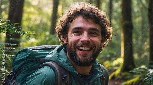 hiking, backpacking, adventure, outdoors, forest, travel, explorer, wilderness, trekking, smiling, happy, bearded man, camper, journey, tree, backpack, joyful, enthusiastic, wanderlust, freedom, green-forest, wild, exploration, positivity, healthy lifestyle, timberland, people, person, face, expression, photogenic, guy, beard, model, smile, fun, casual attire, happiness