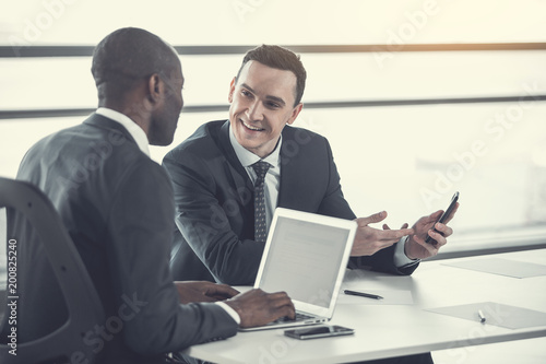 Portrait of cheerful male telling with colleague while holding phone in arm. Employer typing in laptop. Beaming associates talking during job concept