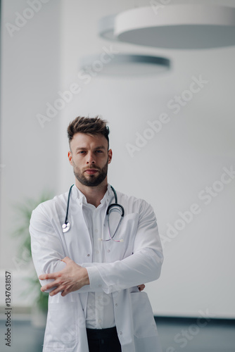 doctor, hospital, health care, medicals, professional, medicine, physician, confidence, portrait, stethoscope, clinic, health, care, male, young, adult, practitioner, white, coat, laboratory, standing, arm, crossed, pose, confident, expertise, modern, clean, bright, background, interior, hallway, corridor, workplace, occupation, job, career, service, treatment, patient, wellness, healthy, lifestyle, trust, expert, specialist
