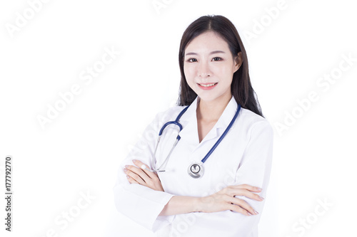 Portrait of Confident smiling Korean Woman doctor posing at white background, healthcare concept