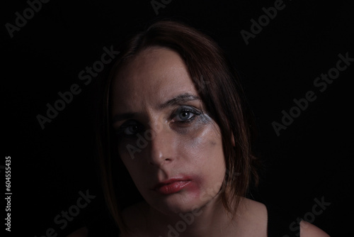 portrait of crying girl with smeared mascara makeup on black background