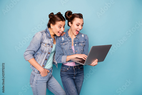 Portrait of cute funny funky hipsters searching information discounts impressed having free time getting notification modern technology isolated dressed denim outfit pastel background