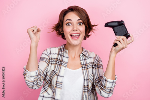 Portrait of delighted cheerful person hold controller raise fist video game champion isolated on pink color background