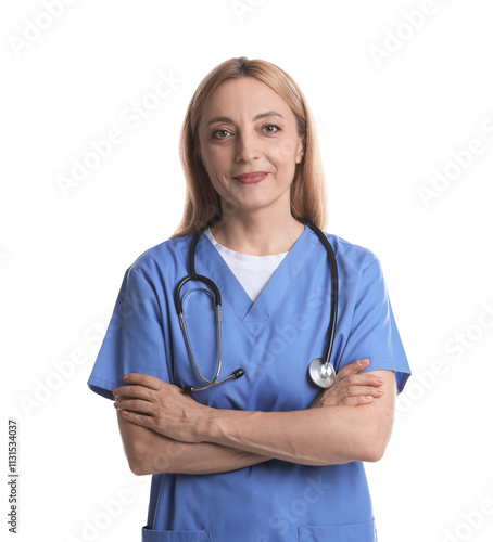 Portrait of doctor with stethoscope on white background