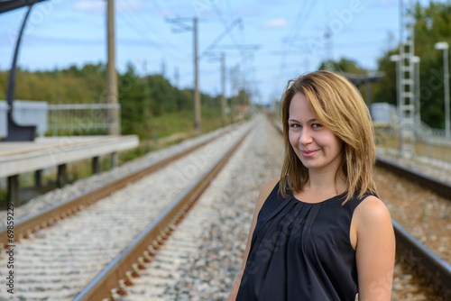 girl, female, woman, platform, station, train, rail, travel, railway, transportation, track, railroad, way, young, road, steel, line, direction, tour tourism, person, junction, departure, lady, waiting, transport, beautiful, beauty, caucasian, pretty, adult, black, top, smiling, copy space