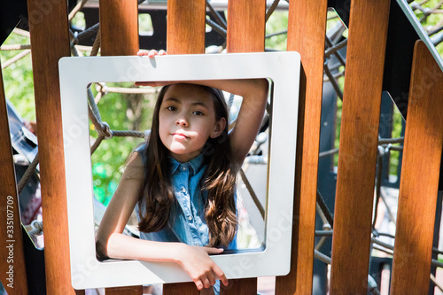 portrait of girl playing on playground in park in summer time. summer vacation