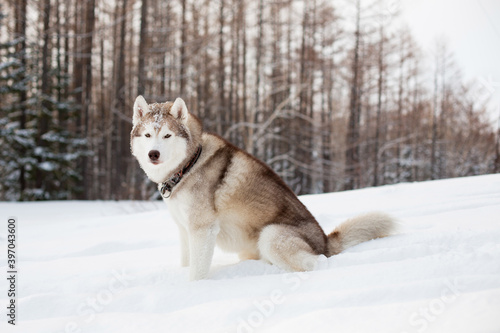 Portrait of gorgeous Husky dog sitting in the winter forest and relaxing at the sunset.