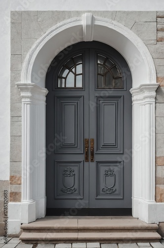Portrait of gray door on white wall background, beautiful architecture aesthetic concept