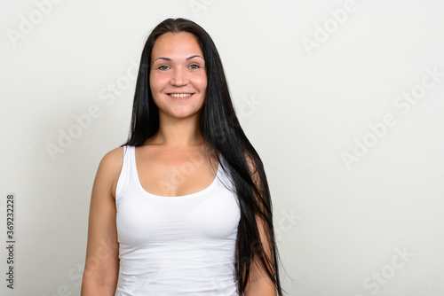 Portrait of happy beautiful woman against white background