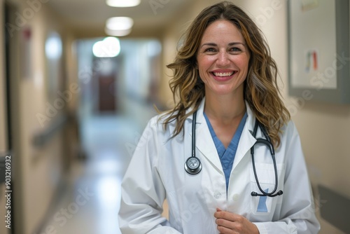Portrait of happy caucasian female doctor smiling in hospital corridor copy space
