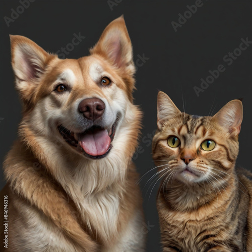 Portrait of Happy dog and cat that looking at the camera together isolated on background