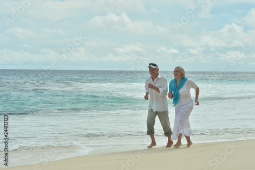 Portrait of happy elderly couple running on tropical beach