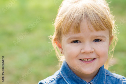 portrait of happy little girl with smile on face on sunny day