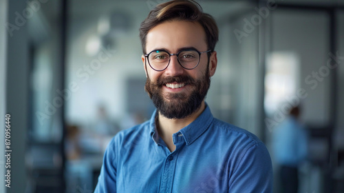 Portrait of happy man with beard in office.
