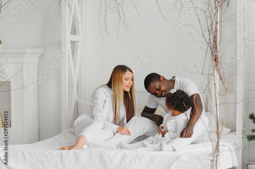 Portrait of happy multiracial young family lying on cozy white bed at home, smiling international mom and dad relaxing with little biracial girl child posing for picture in bedroom