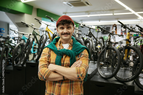 happy, smiling, hipster, man, shop, display, new, mountain, bike, collection, rack, showcase, closeup, bicycle, sport, store, assortment, arrival, transportation, cycle, row, gear, tire, biking, chain, equipment, transport, sale, retail, indoor, vehicle, modern, shopping, merchandise, professional, service, accessory, purchase, buy, bicyclist, cycling, person, buying, market, showroom, people, buyer, shopper, choosing