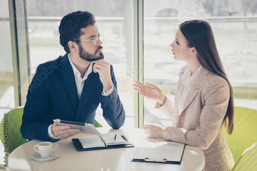 Portrait of his he her she two nice attractive stylish classy people ceo boss chief agent broker economist consultant discussing innovation project at light white workplace workstation
